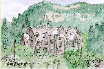 バンフ滞在の4日間宿泊したホテルです。この絵は本館部分を描いたものですが、実は私たちの部屋は「スイス・ウイング」といってこの建物に隣接した安価なロッジで、冷房がないため窓を明けると本館のエアコン用冷却ファンの騒音が大きくて悩まされました。 |