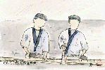 川崎市と千葉県木更津市の間を海底トンネルと橋で結んだ全長約15.1kmの「東京アクアライン」が一昨年暮完成し、海底トンネルと橋がつながる部分に「海ホタル」と名づけられた人工島があります。この絵は島の中央部を描いたものです。3連休の初日でしたが人出はまあまあという感じでした。天候が良ければ東京湾や羽田空港なども一望でき、一度は訪れる価値があると思います。 |